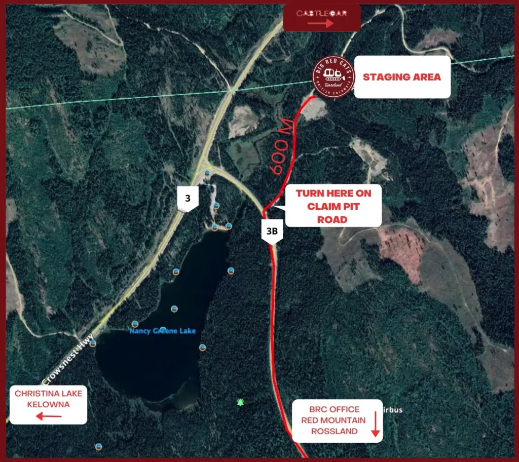 All guests are expected to drive to the BRC staging area 24.8km (15.4 Miles) North of Red Mountain Resort along Highway 3B – 600m up Claim Pit Road. It is a 25-30 minute highway drive. Meeting time is 8:30am. There is no cell service on the route so be sure you know before you go.