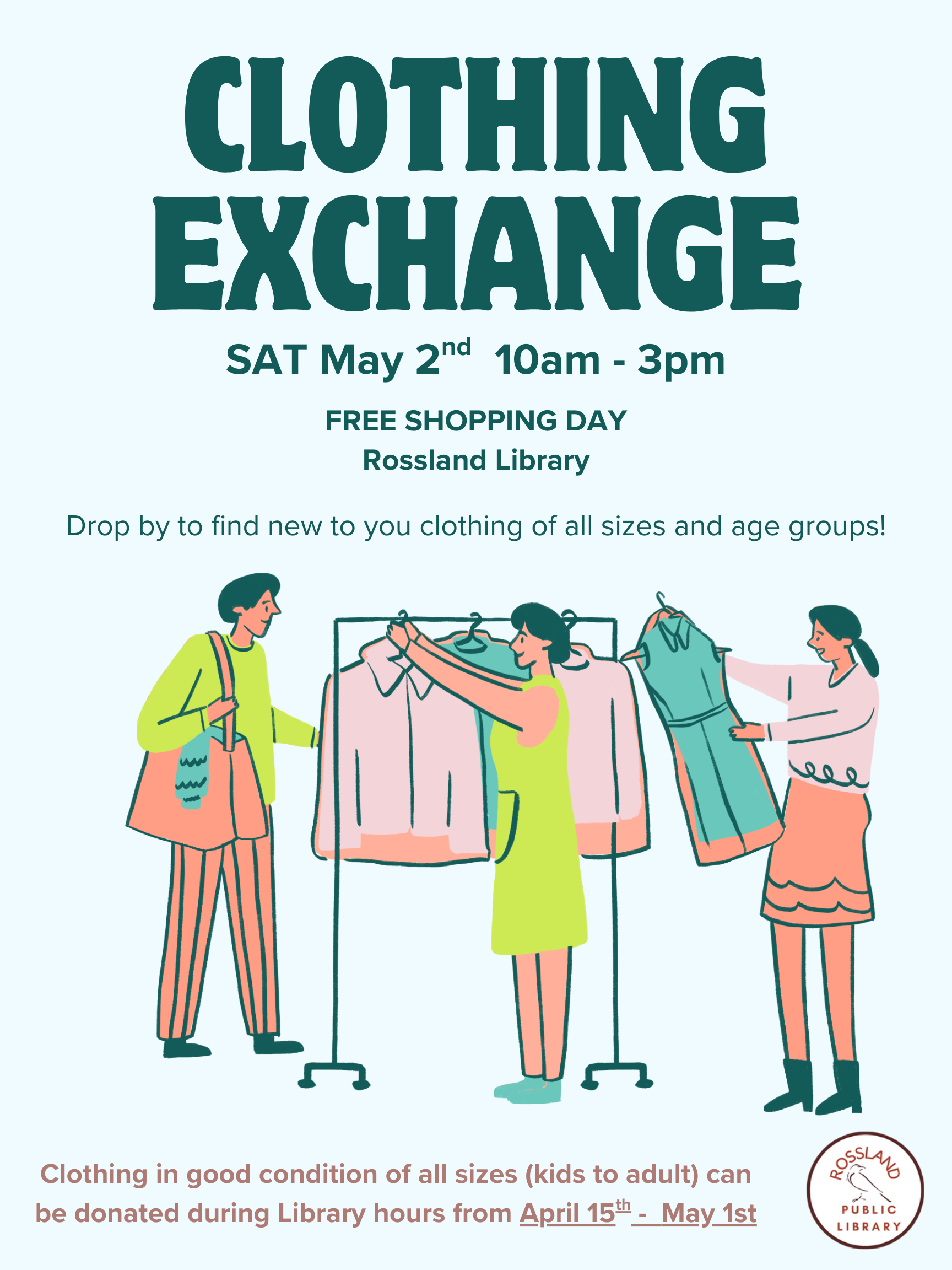 Clothing Exchange at Rossland Library! Find something new-to-you at our Free Shopping Day May 2nd.